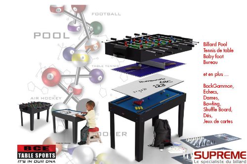Meuble transformable de la marque BCE. Merveille d'ingéniosité, ce meuble vous permet de jouer au billard (pool ou snooker), au baby foot et au Tennis de Table !!! Meuble d'une grande stabilité. Pieds fixes. Couleur Noire. Support transformable, fourni avec tous les accessoires nécessaires pour de nombreuses utilisations : - Billard pool et snooker, fourni avec queues et billes, - Tennis de table, fourni avec raquettes et balles, - Baby foot, fourni avec balles, - Tableau Blanc. De plus, nous vous offrons un ensemble de 7 mini-jeux et d'accessoires permettant encore plus d'activités telles que : - BackGammon, Echecs, Dames, Bowling, Shuffle Board, Dés, Jeux de cartes. Dimensions : Ext. : L = 135 cm l = 60 cm. Jeu : L= 110 cm. l = 57 cm. Hauteur : 84 cm. Poids : 28.6 Kg.